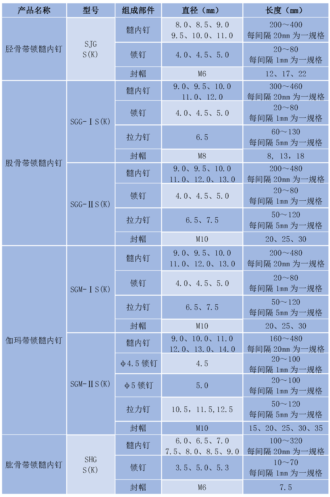 适用于股骨干骨折、股骨近端和干骺端骨折、胫骨干骨折、肱骨干骨折等内固定。
